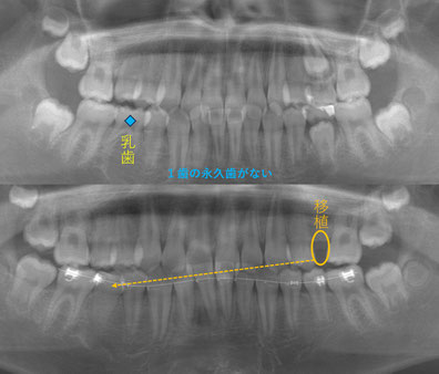 左上の5番目の歯を右下の5番目に移植しています。移植後2か月目で神経がつながっている、つまり生きている反応が検査で出てきました。