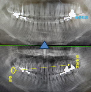 病気が大きいため抜歯した所に下顎から親知らずを移植しました。この場合は、歯の神経などを取り除く根管処置が必須となりますが、しっかり処置できていれば全く問題なく移植歯は健全な状況を保ちます。
